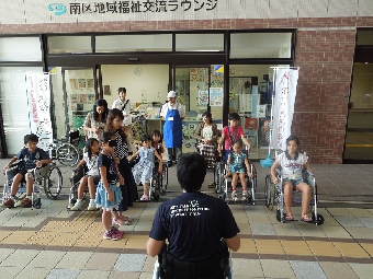 ボーノ2階の交流ラウンジを出発場所とし、申し込みのあった子ども達8人と一緒に参加してくださったお母さん2人の併せて10人が障がい者の疑似体験をします。