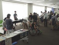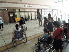 訪れた子ども達が会場内を車椅子に乗って進みます。みんな思ったより上手に車椅子を操作しているのにビックリです。