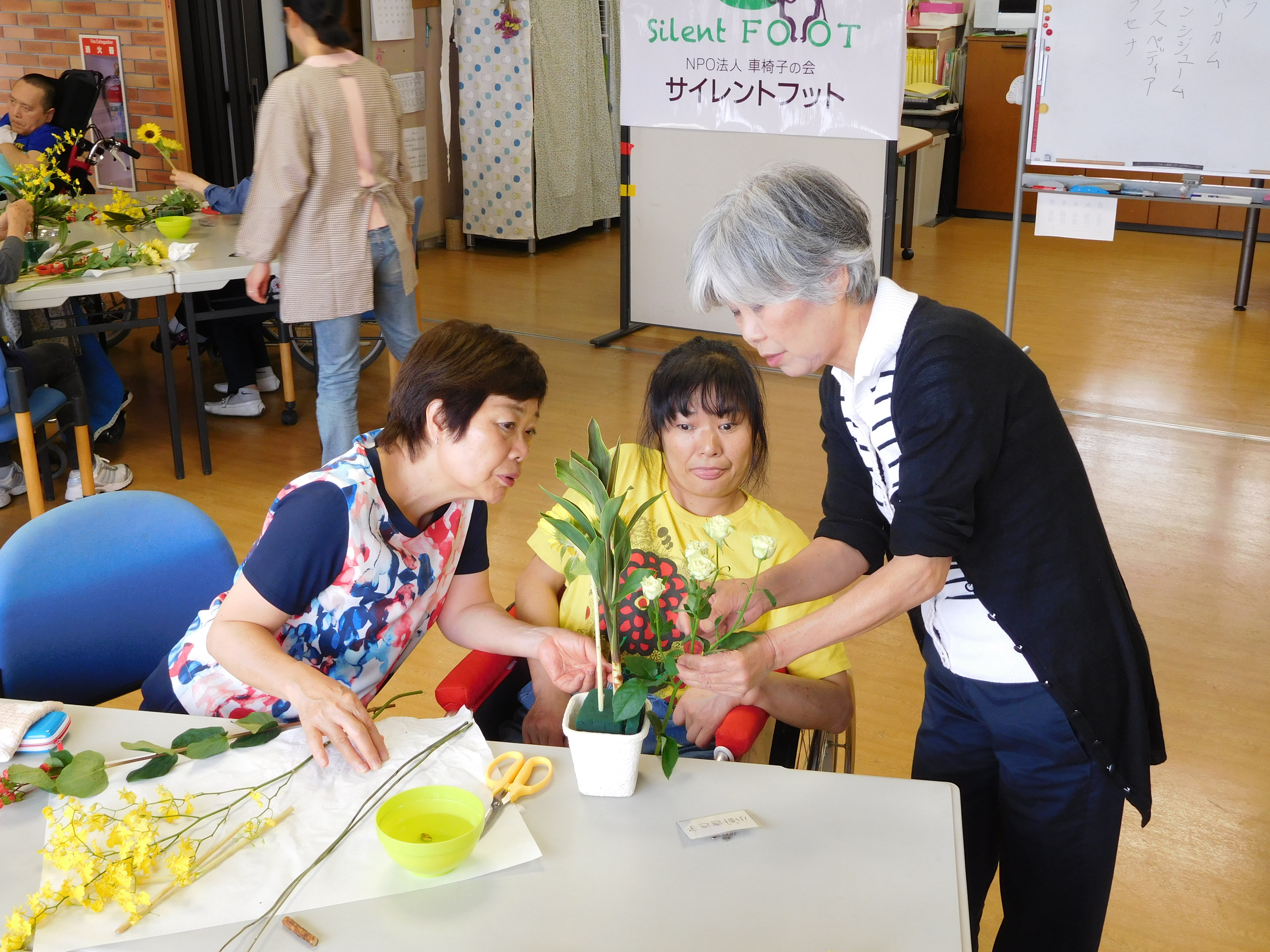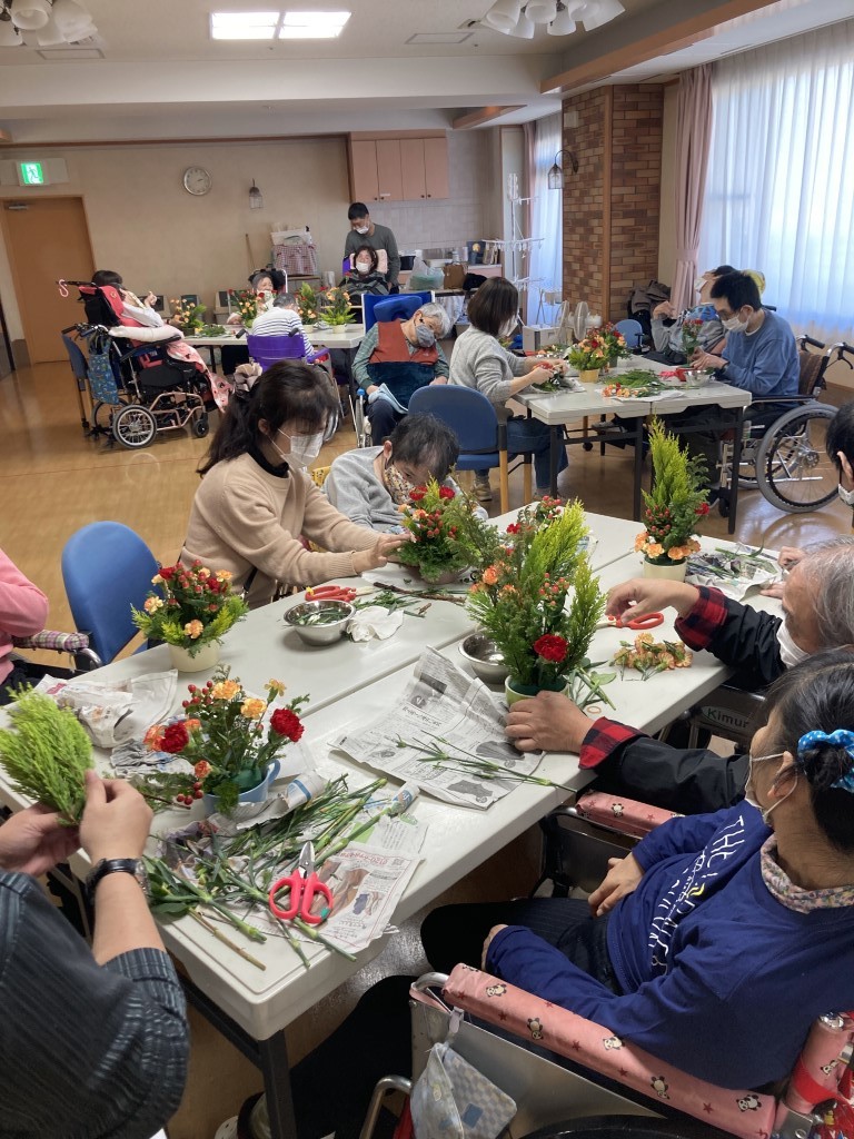 参加者の皆さんは、私達も含めて施設外の人と会うのは久しぶりとの事、当然フラワーアレンジメントも久しぶりなんです!でも皆さん手際よく作られていきますよ。